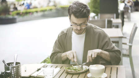 A handsome bearded man in eyeglasses eating fresh salad at cafe outdoors alone