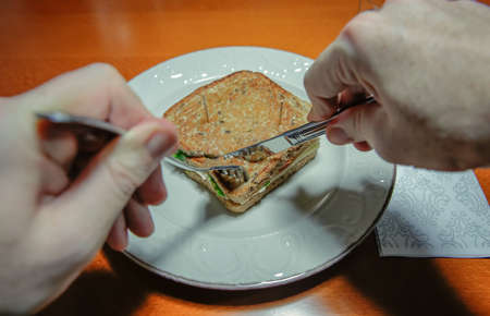 Closeup of man hands cutting sandwich with a fork and knife served in a plate over a wooden table