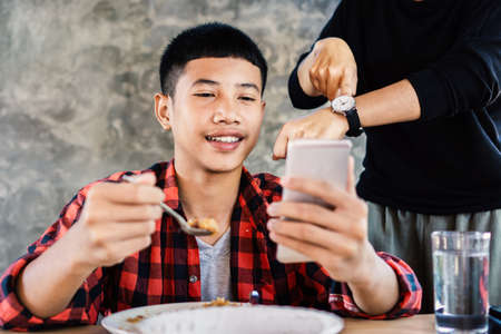 Asian boy playing the game while eating dinner ignoring his angry mother
