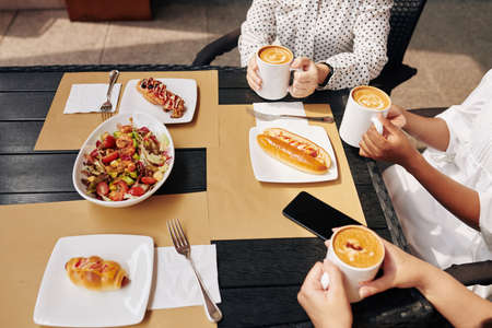 Group of female friends meeting at cafe to eat delicious food and discuss news and juicy gossips
