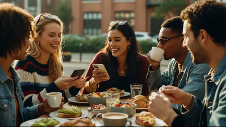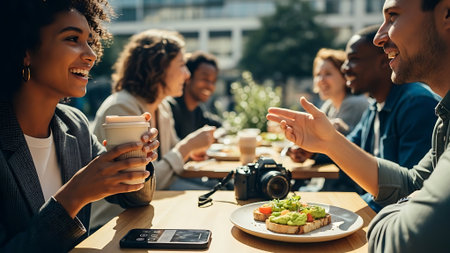A group of friends enjoying brunch at a restaurant, featuring avocado toast with poached eggs in the foreground, laughter and conversation, warm sunlight