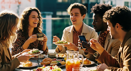 A group of six friends, diverse in ethnicity and age, sit around a table laden with food and drinks, laughing and chatting on a sunny day.