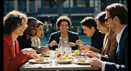 A group of diverse friends enjoying a meal together outdoors in the city