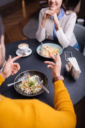 Cropped view of man pointing with finger near salad and smiling girlfriend on blurred background in restaurant