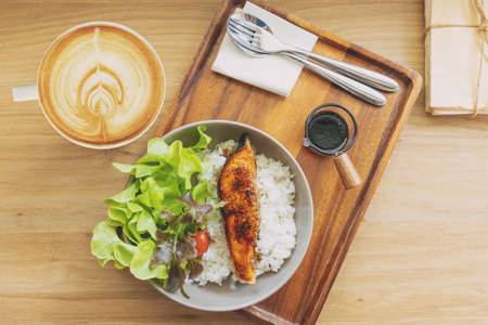 healthy food meal Japanese rice with Salmon Teriyaki with salad vegetable high Omega 3 vitamin menu.