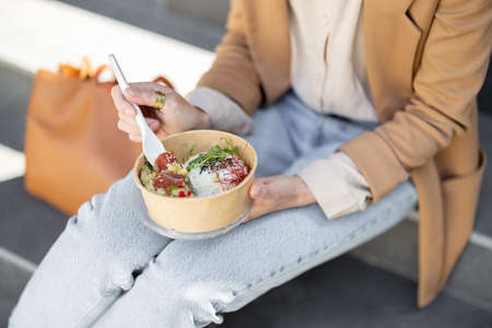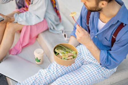 Stylish colleagues eat healthy take away food from a bowl during a lunch time outdoors. Concept of healthy vegan snack on work. Cropped view