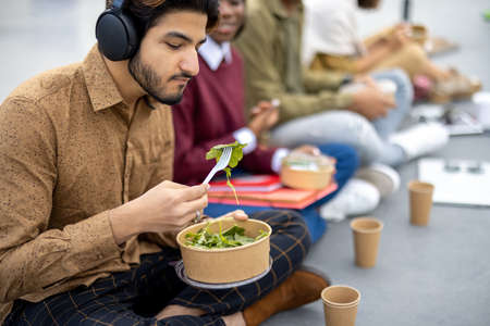Multiracial students sitting and eating salad during lunch on asphalt at university campus. Concept of education and learning. Idea of student lifestyle. Young smiling friends at food break
