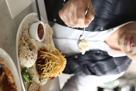 Cropped image of food on the table in front of white shirt man holding spoon and fork at lunch time, a meal.