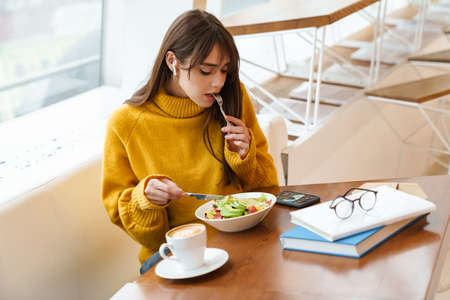 Charming focused girl in earphones using mobile phone while having lunch in cafe indoors