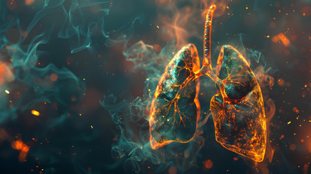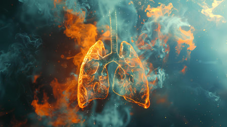 Abstract digital representation of lungs in flames, symbolizing respiratory health and medical technology. High quality photo