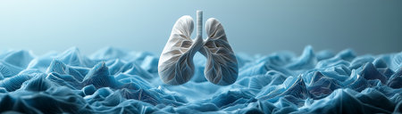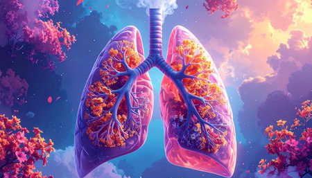 A vibrant, artistic rendering of the human lungs with visible airways and alveoli, highlighted with soft lighting to emphasize the respiratory system