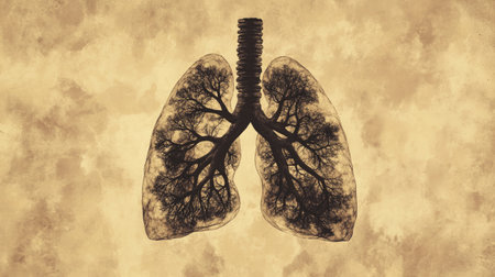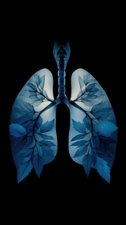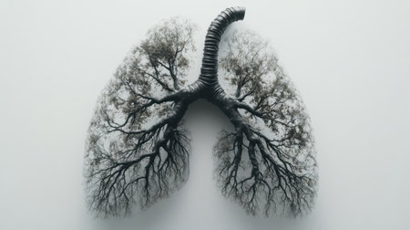 An artistic visualization features a pair of human lungs, with elaborate branching structures resembling trees. This imaginative depiction highlights the intricately anatomical details and textures