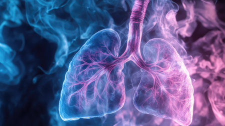 Detailed representation of human lungs illuminated in a smoky atmosphere, emphasizing their vital role in respiration and overall health. The image showcases clarity and anatomical precision, perfect for educational or healthcare-related projects.