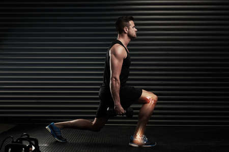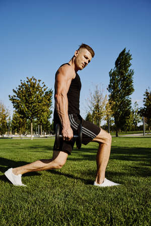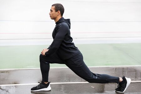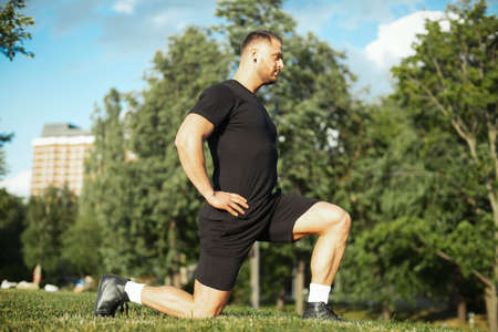 Handsome young confident sportsman exercising at the stadium outdoors, lunges