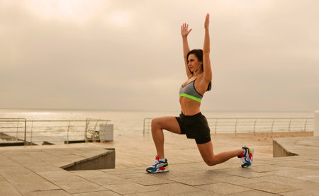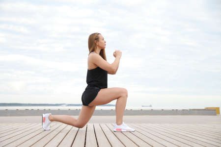 Slim fit red-haired woman in sportswear practices lunges on the beach. healthy lifestyle