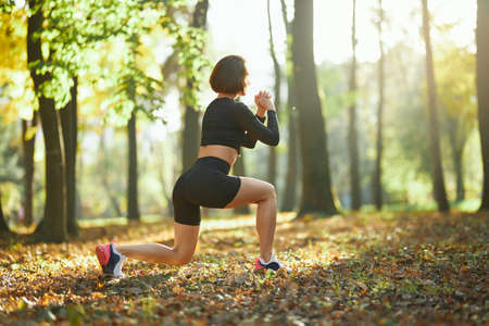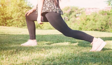 Active fit woman in sportswear is practicing stretching exercise in the park on a bright sunny day. Healthy lifestyle, fitness concept