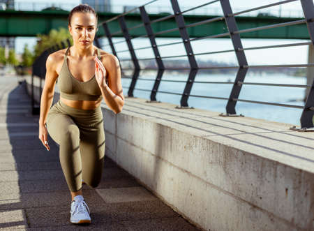 Stretching. Female runner, athlete training outdoors. Professional runner, jogger working out on the street. Concept of healthy lifestyle, sport, wellness, wellbeing, motion and action, activity.