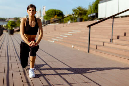 Young fitness woman runner stretching legs before run. Young sportswoman warming up before training outdoors. Sport and stretch concept