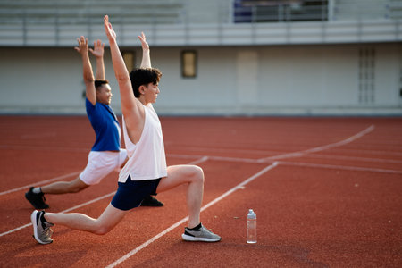 Two asian athlete men are stretching their arms and legs together on the racetrack in sports stadium. Jogging or Running, Outdoor exercise or work out.