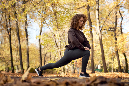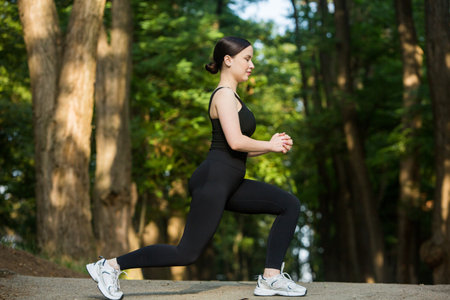 Active woman with obesity exercising and doing lunges at the gym. Overweight woman with a fitness lifestyle