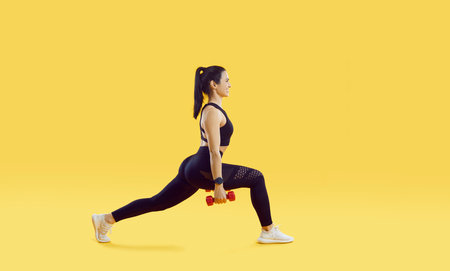 Happy athlete enjoying fitness workout. Profile view of sporty fit attractive young woman in black leggings and crop top holding dumbbells, smiling and doing forward lunges exercise. Sport concept