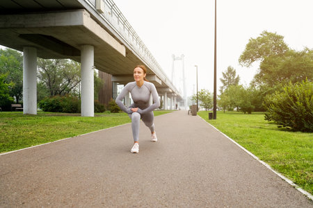 Woman a runner is stretching on the asphalt road outdoors.