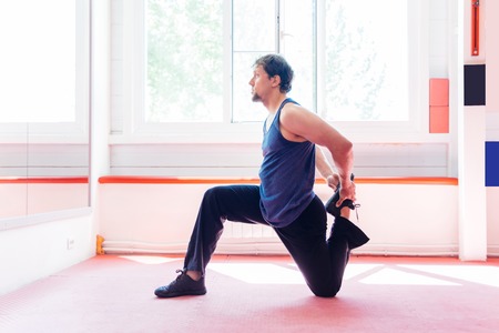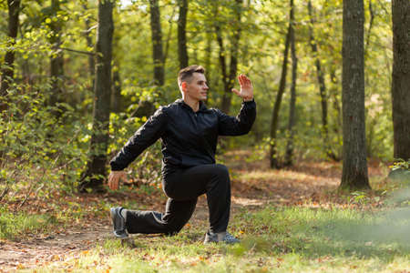 Young attractive man stretching legs outdoors doing forward lunge.