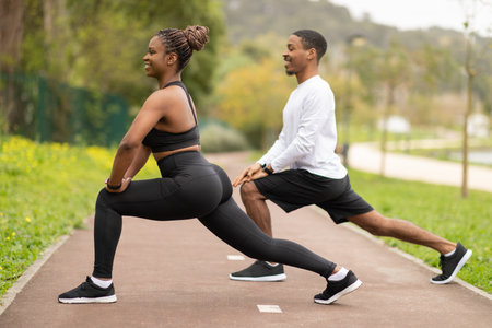 Happy young african american woman and boyfriend doing leg exercise, stretching and warm up in park