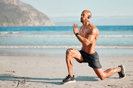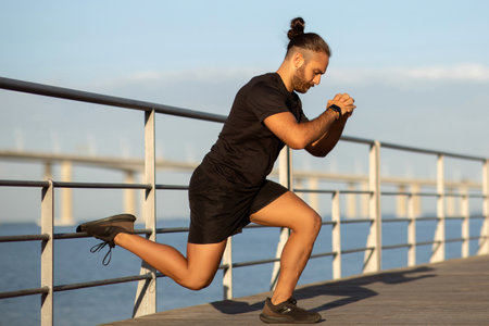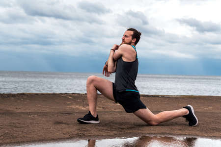 athlete guy doing single leg lunge training by the seaside
