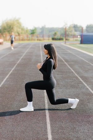 Morning exercises on running track, beutiful yound sportswoman makes fitness in the morning, outdoors