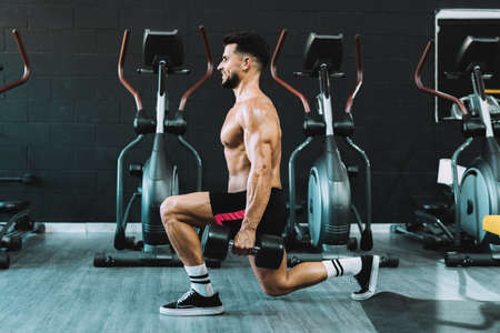 A beautiful woman trains at gym doing lunge with dumbbells for building the muscles, concept of healthy lifestyle, sports, training, wellness, and sport