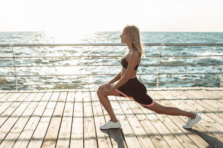 Super fit attractive young woman wearing fashionable outfit working out being active outside during sunny weather. Stretching her legs or practice yoga next to sea