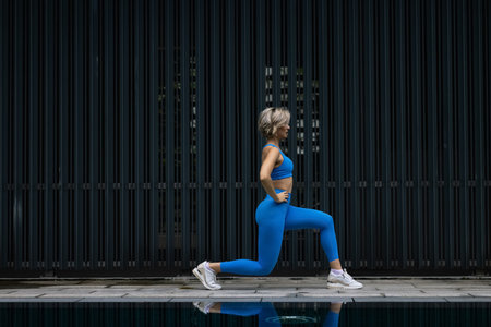 African American fitness lady stretching legs lunging forward, blue background