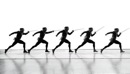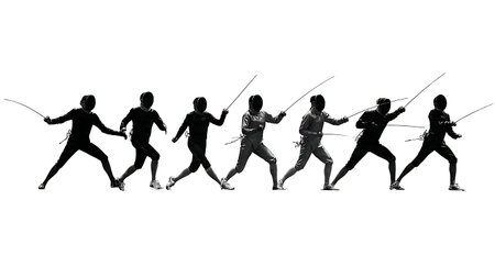 Fencing Footwork Line Drill Silhouette Set of Six isolated on plain white background.