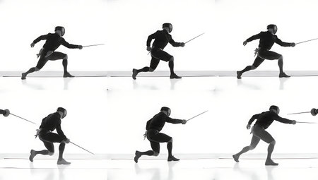 Fencing Passata Sotto Ducking Attack Silhouette Set of Six isolated on plain white background.