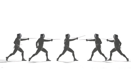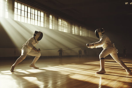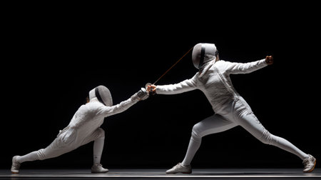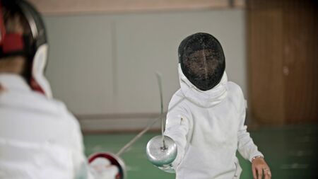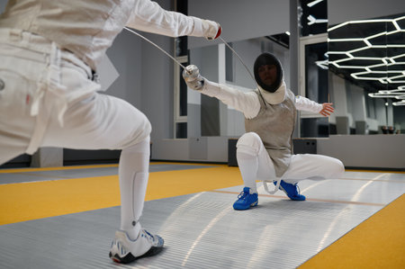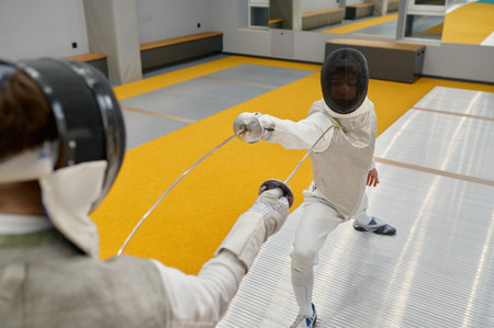 Duel of fencers during fencing match, training lesson at martial art class