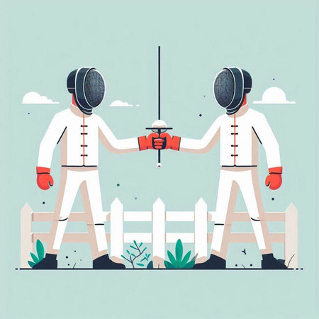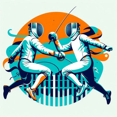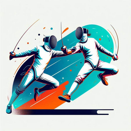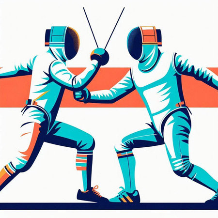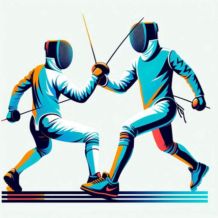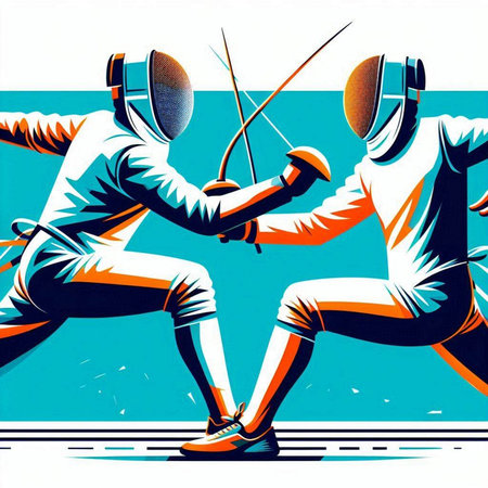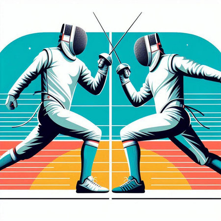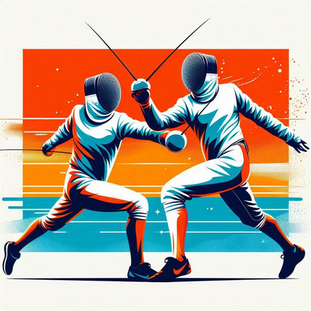 illustration of two fencers fighting on a white background, retro style