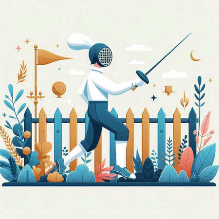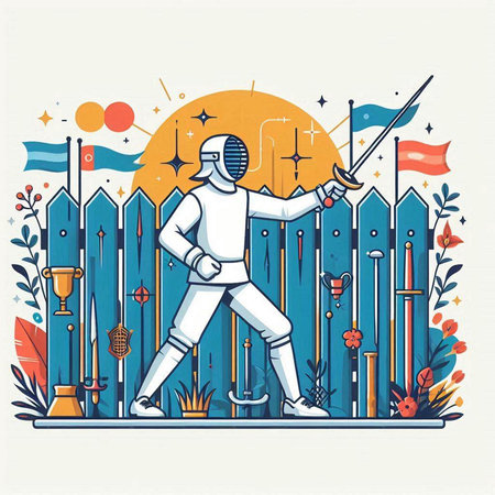 Fencing. Vector illustration in flat linear style. Cartoon character.