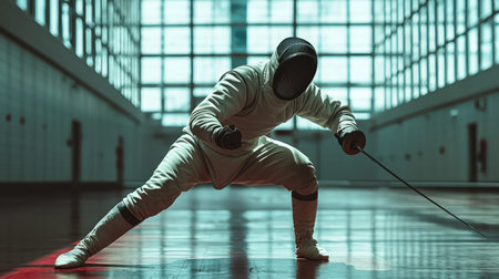 Athlete focuses intently while practicing fencing techniques in a bright and spacious gym.