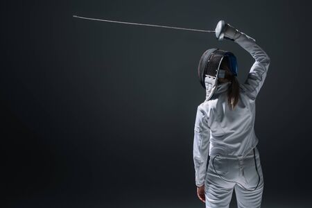 Back view of fencer holding rapier above head isolated on black