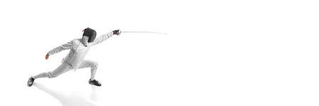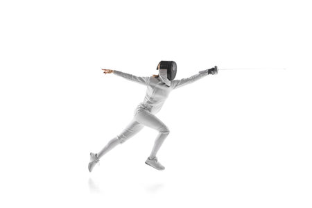 Women in competitive sports. A female fencer in action, promoting womens participation in competitive sports. Woman, fencer training over white background