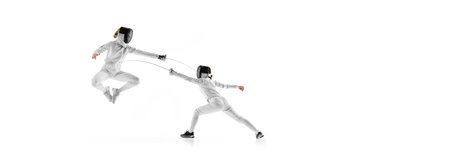 Banner. Two female fencers practice their techniques against white studio background with negative space to insert text. Concept of professional sport, competition, strength and power, action. Ad