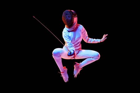Movement. Teen girl in fencing costume with sword in hand isolated on black background, neon light. Young model practicing and training in motion, action. Copyspace. Sport, youth, healthy lifestyle.