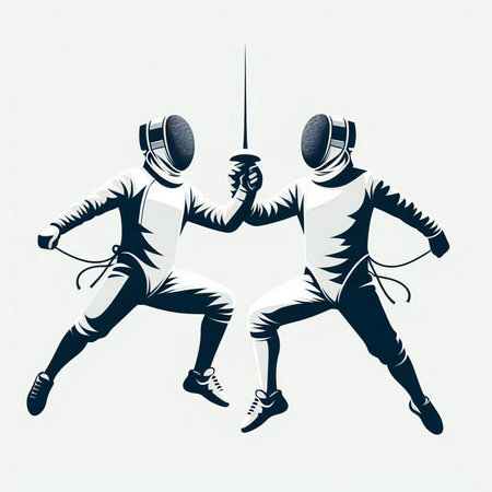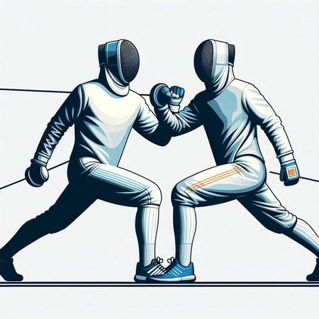 illustration of two fencing athletes on white background with space for text