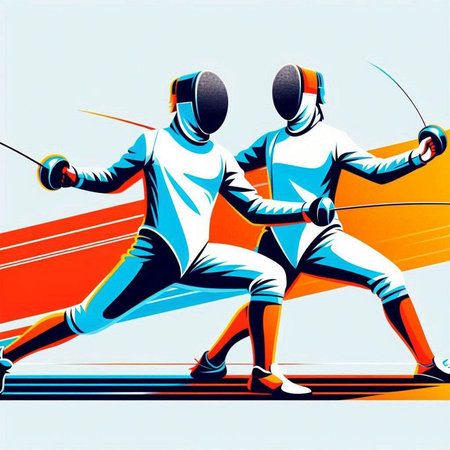 fencing sport poster with two athletes in action, vector illustration.