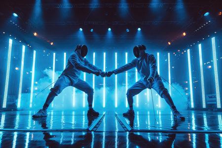 Two fencers clad in white attire skillfully duel with their swords, illuminated by striking neon lights.