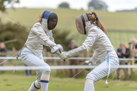 Two young and beautiful fencers are training