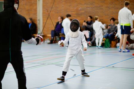 Little kid boy fencing on a fence competition. Child in white fencer uniform with mask and sabre. Active kid training with teacher and children. Healthy sports and leisure.
