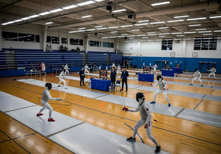 Fencers are attacking each other in the school gym