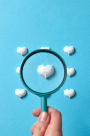 Womans hand holds big loupe above heart pattern.